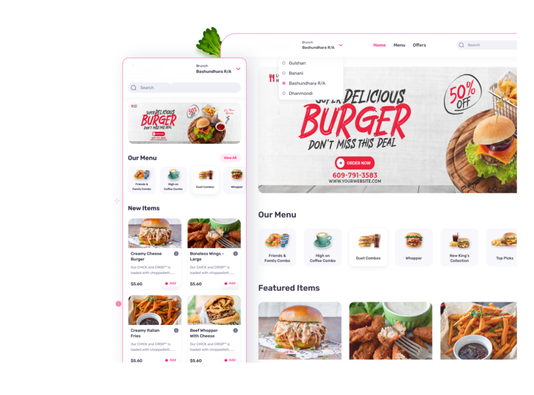 Votre site web devient votre meilleur serveur : un design moderne pour présenter votre menu et attirer vos clients dès la première visite. Grâce à une interface intuitive, vos clients peuvent passer leurs commandes en ligne facilement, que ce soit pour la livraison, le retrait ou la réservation sur place. Les paiements sont sécurisés, et toutes les commandes sont centralisées pour une gestion simple et efficace de votre activité au quotidien.